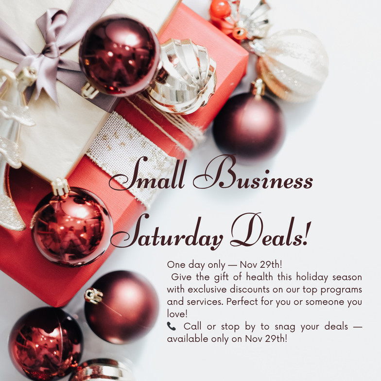 Join us Saturday, November 29th for Small Business Saturday and take advantage of our exclusive one-day specials — perfect for gifting health and wellness this holiday season! Whether you’re shopping for loved ones or treating yourself, our limited-time offers will help you start 2026 feeling your best.